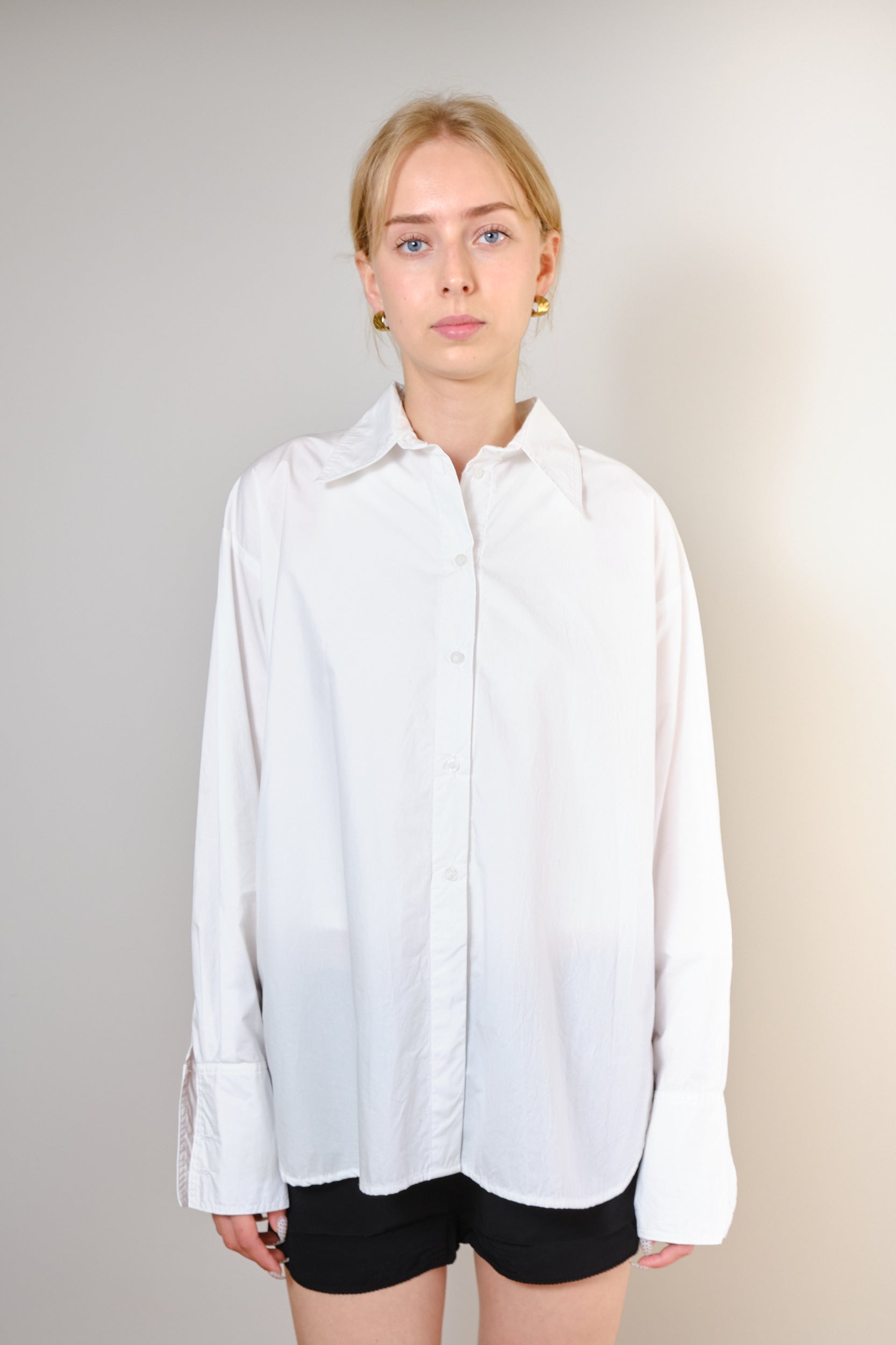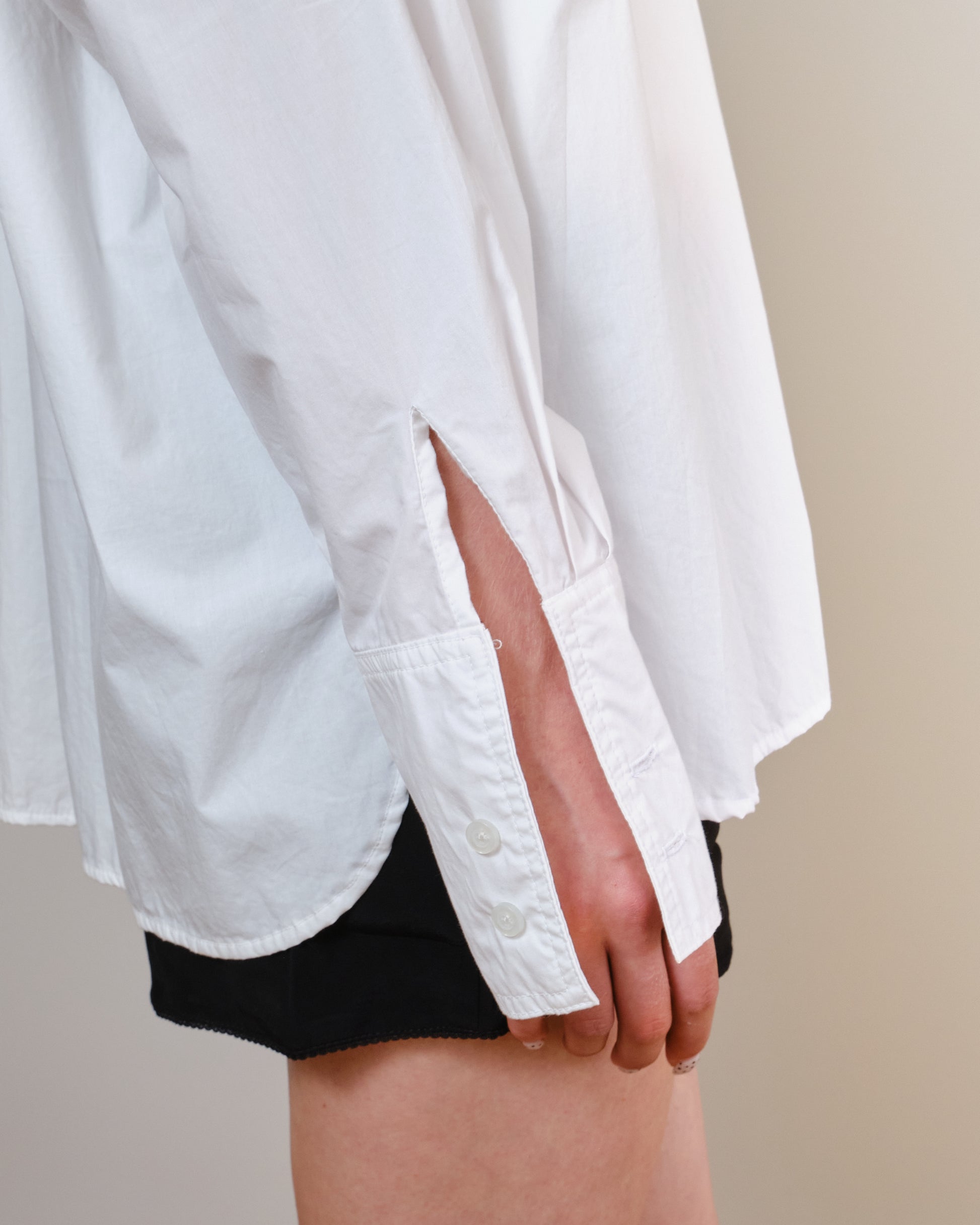 Classic menswear-inspired button up shirt in 100% premium cotton with center front exposed placket and classic shirt hem finish.