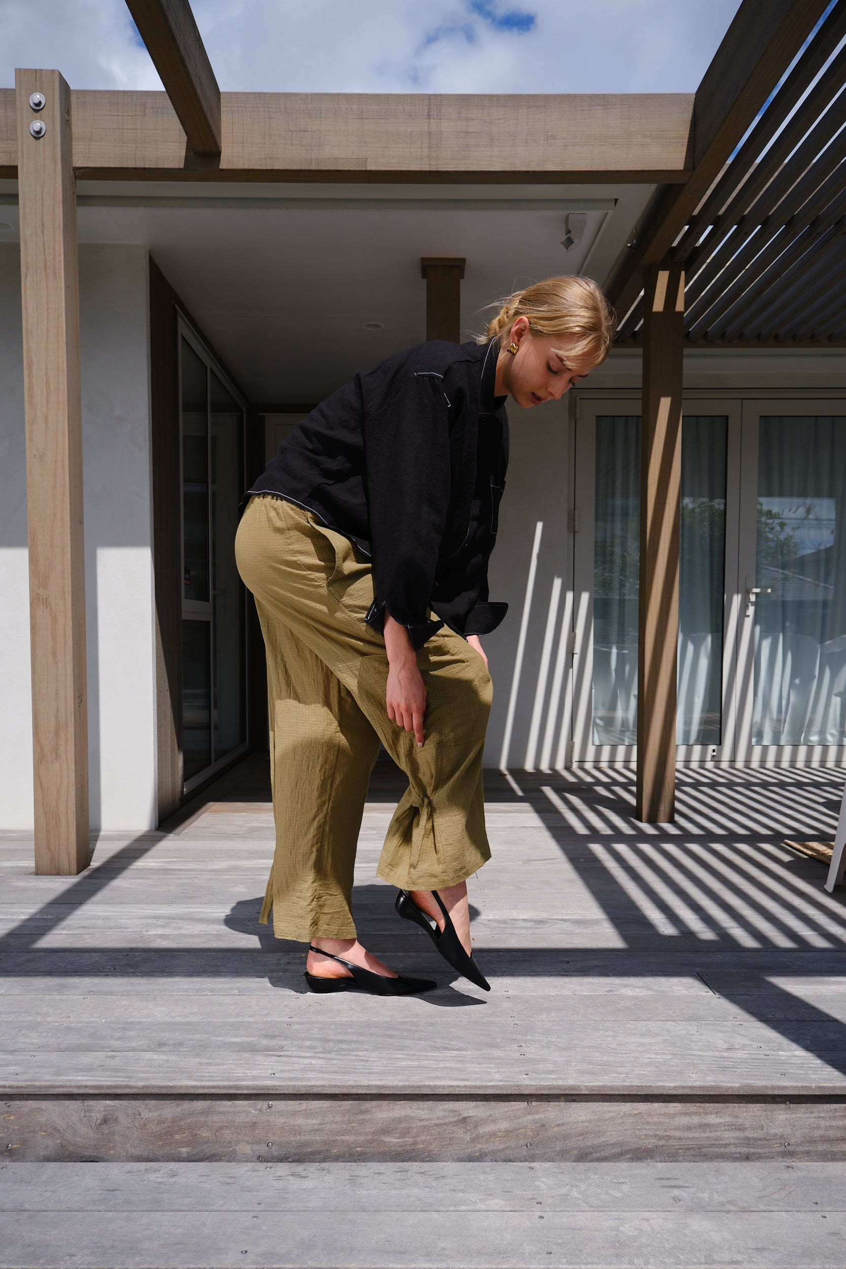 Relaxed mid-waist tailored Sunrise Pant in timeless green cotton. These pant feature a comfortable elastic waistband for a perfect fit. Crafted from 100% high-quality cotton, offer both comfort and elegant, making them a must-have addition to your wardrobe.